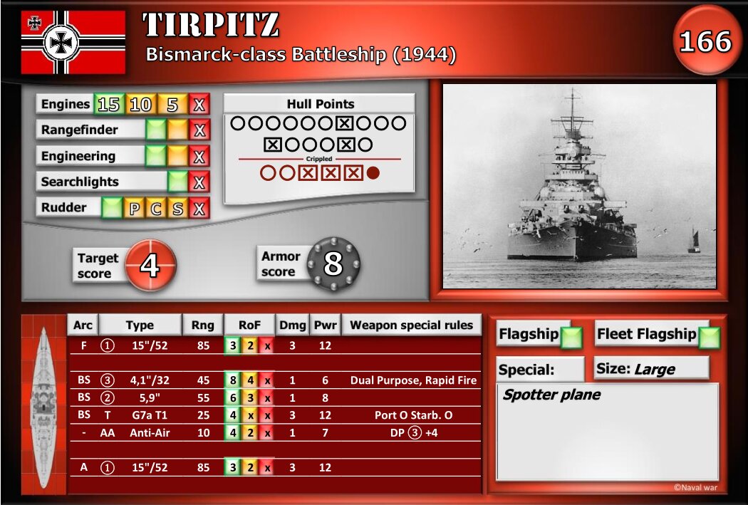 Tirpitz's career was less dramatic; she was sent to Norwegian waters in 1942, where she acted as a fleet in being, threatening the convoys from Britain to the Soviet Union. She was repeatedly attacked by the Royal Navy and Royal Air Force. In 1944, Lancaster bombers hit the ship with three Tallboy bombs, which caused extensive internal damage and capsized the battleship. Tirpitz was broken up for scrap between 1948 and 1957.